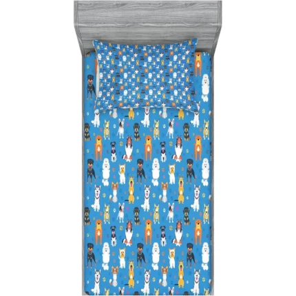 Twin XL Size 2-Piece Dog-Themed Bedding Decor Set – Multicolor, Joyful Canine Puppy&Paw Traces Graphic Design on Blue Background