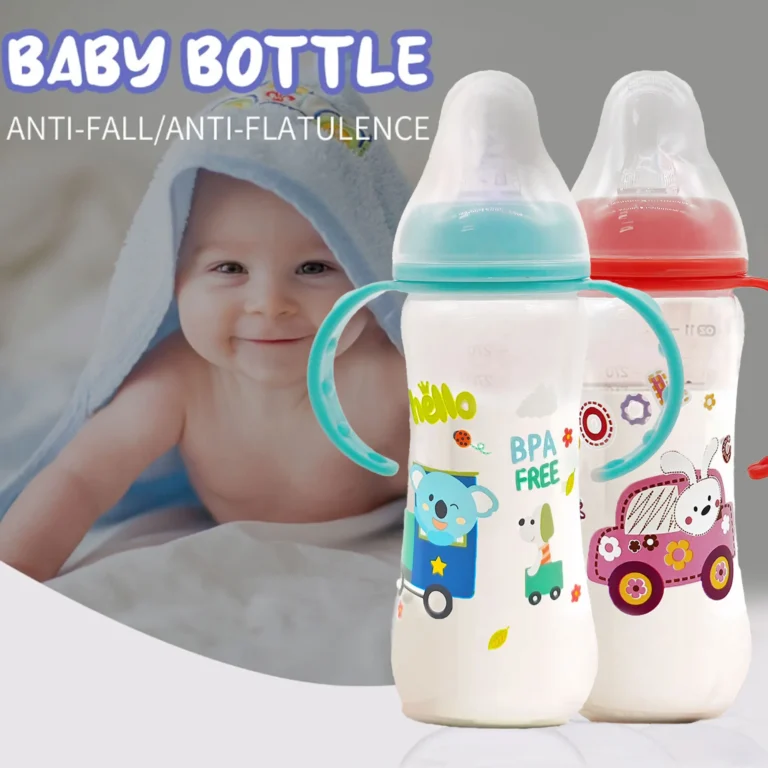 Lightweight and drop-resistant 250ml bottle with cartoon handle and breastmilk silicone nipple, PP bottle for 0-36 babies