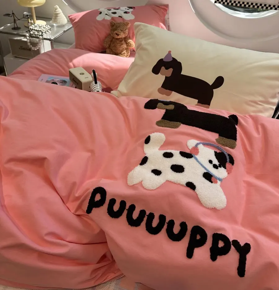 Cute towel embroidery dog cat brown green bedding set,twin full queen king cotton home textile bed sheet pillow case quilt cover