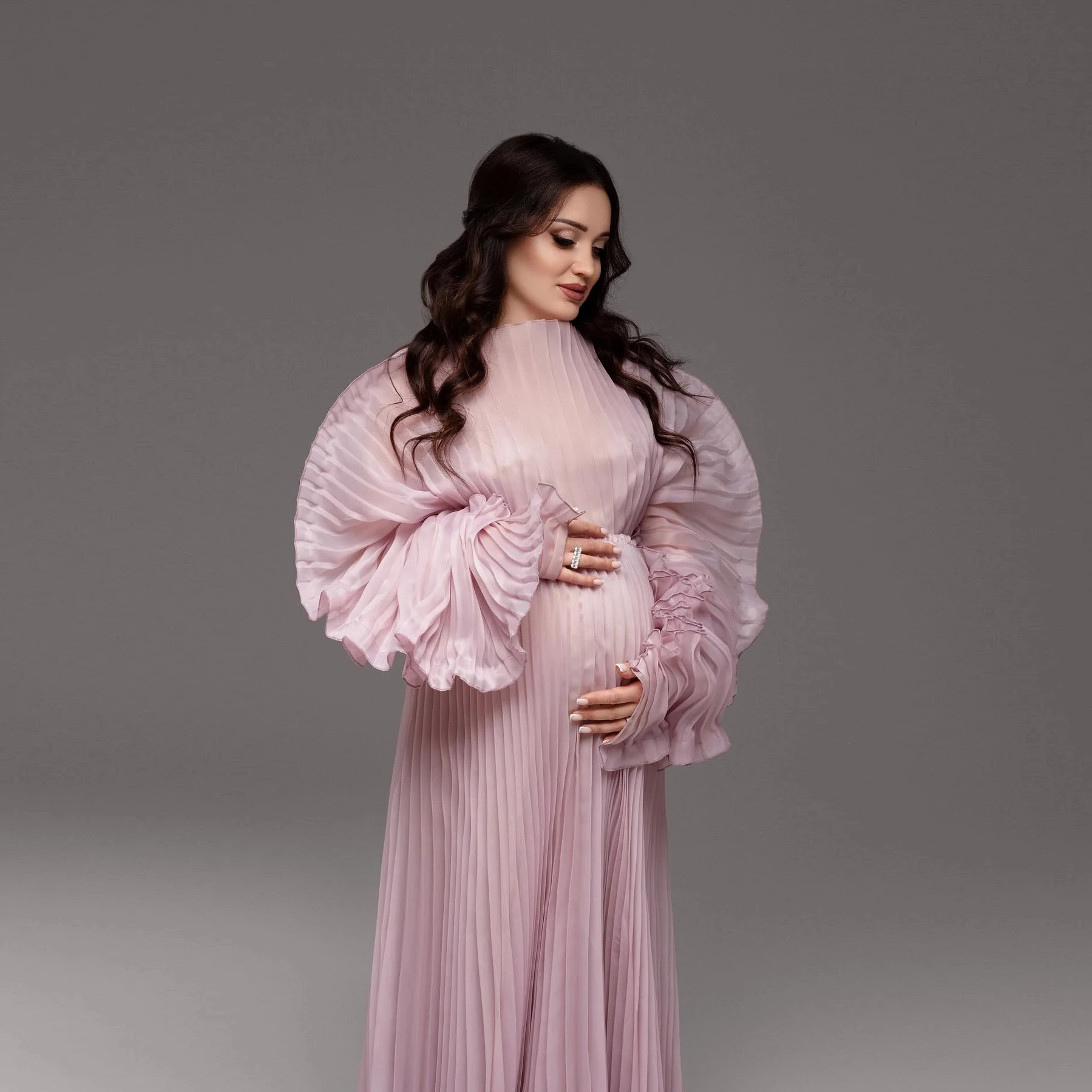 Elegant for Photoshoot Pregnancy Maternity Dress Babyshower Party Wear Pink Maxi Prom Gowns Pleated Sleeves Maternity Dresses