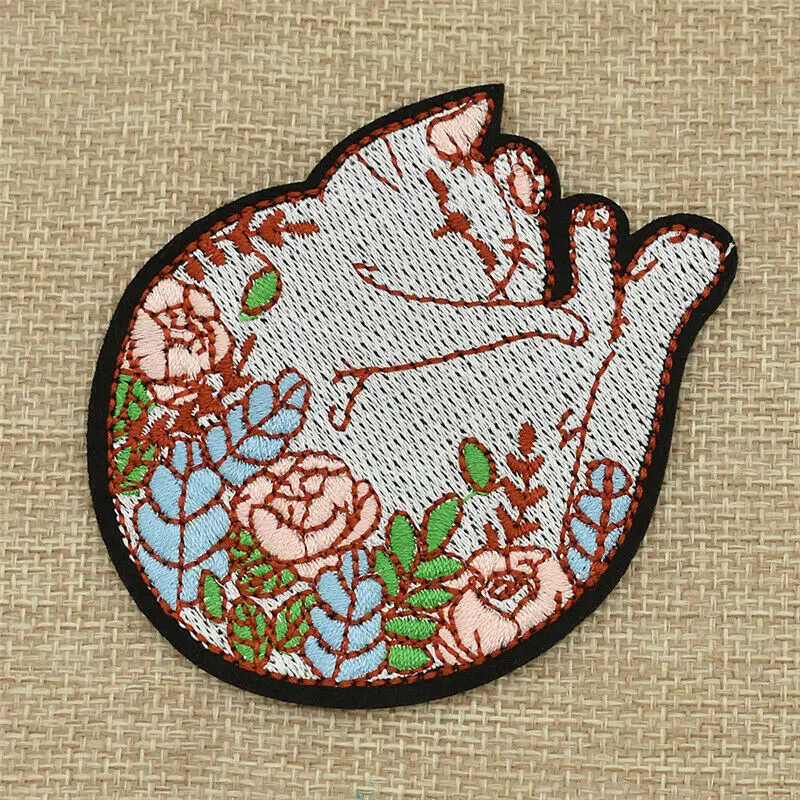 Flower Sleeping Cat Embroidery Patch (≈7.9*7.5cm) Iron on Applique Decor for Bag Clothes ワッペン PUNK Hippie Embroidery Sewing