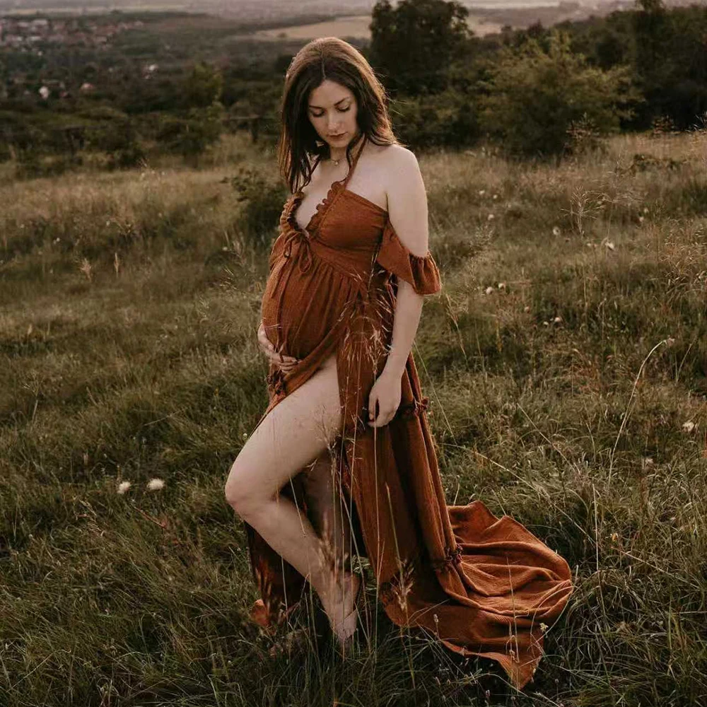Maternity Dress Photoshoot Boho Off Shoulder Ruffle Maxi Gown Forest Theme Pregnancy Photography Outfit Shower Photo Wear
