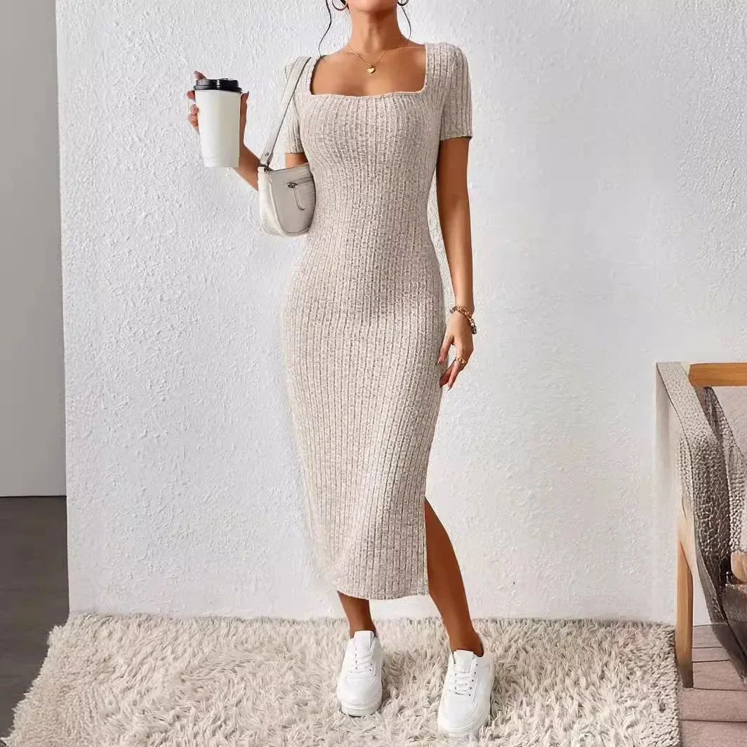 Maternity Dresses Hot Fashion Square Neck Side Knit Solid Color Clothes Pregnant Women Short-sleeved Dress Pregnant Women