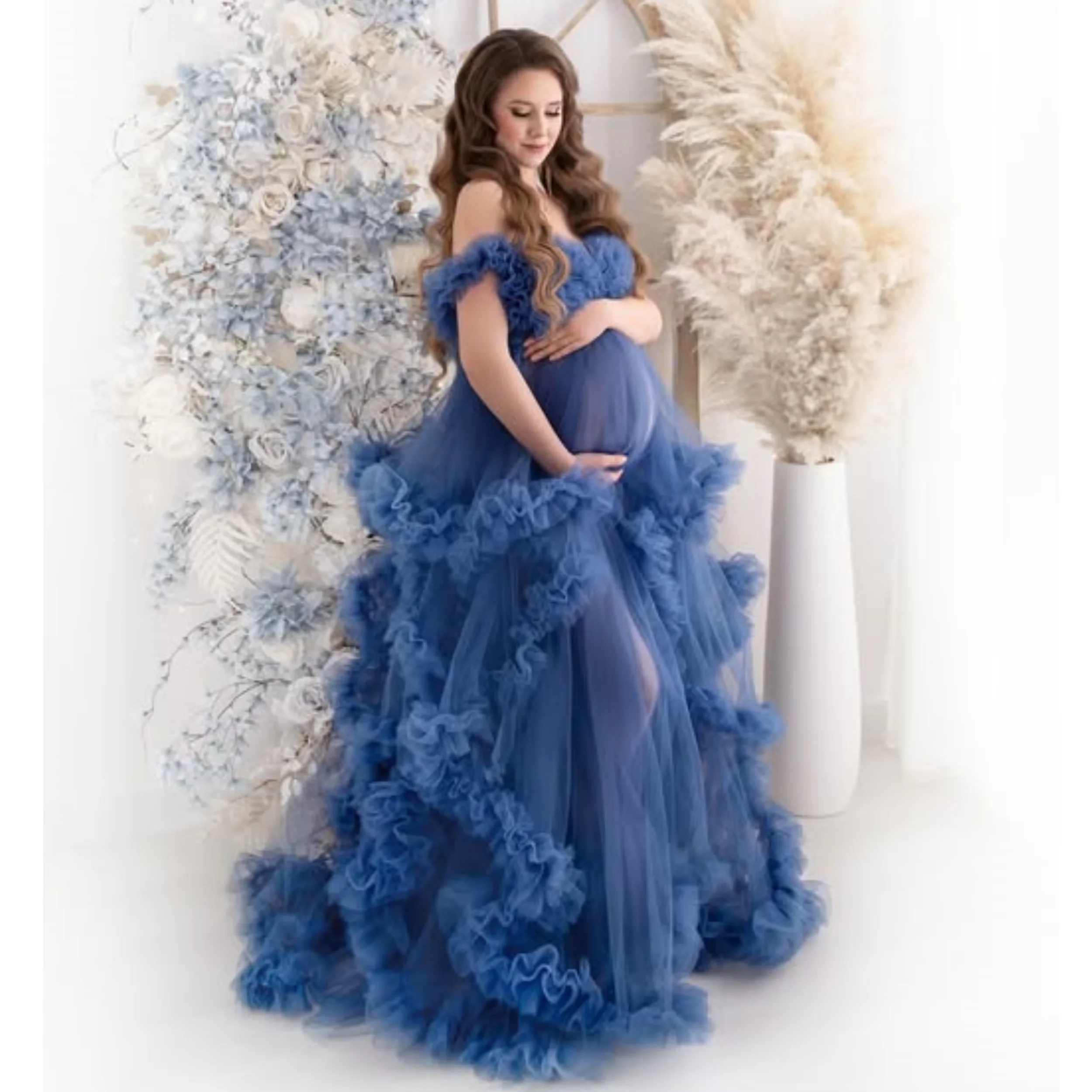 Ruffles Maternity Dress for Photoshoot Customized Off Shoulder Blue Prom Dress Party Wear Outfit Pregnancy Babyshower Bathrobe