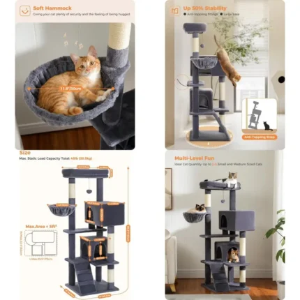 Large Indoor Cat Tree with Extra Large Perch, Hammock, and Sleeping Bag, Multi-Level Cat Shelves with Scratching Posts and 2 Hou